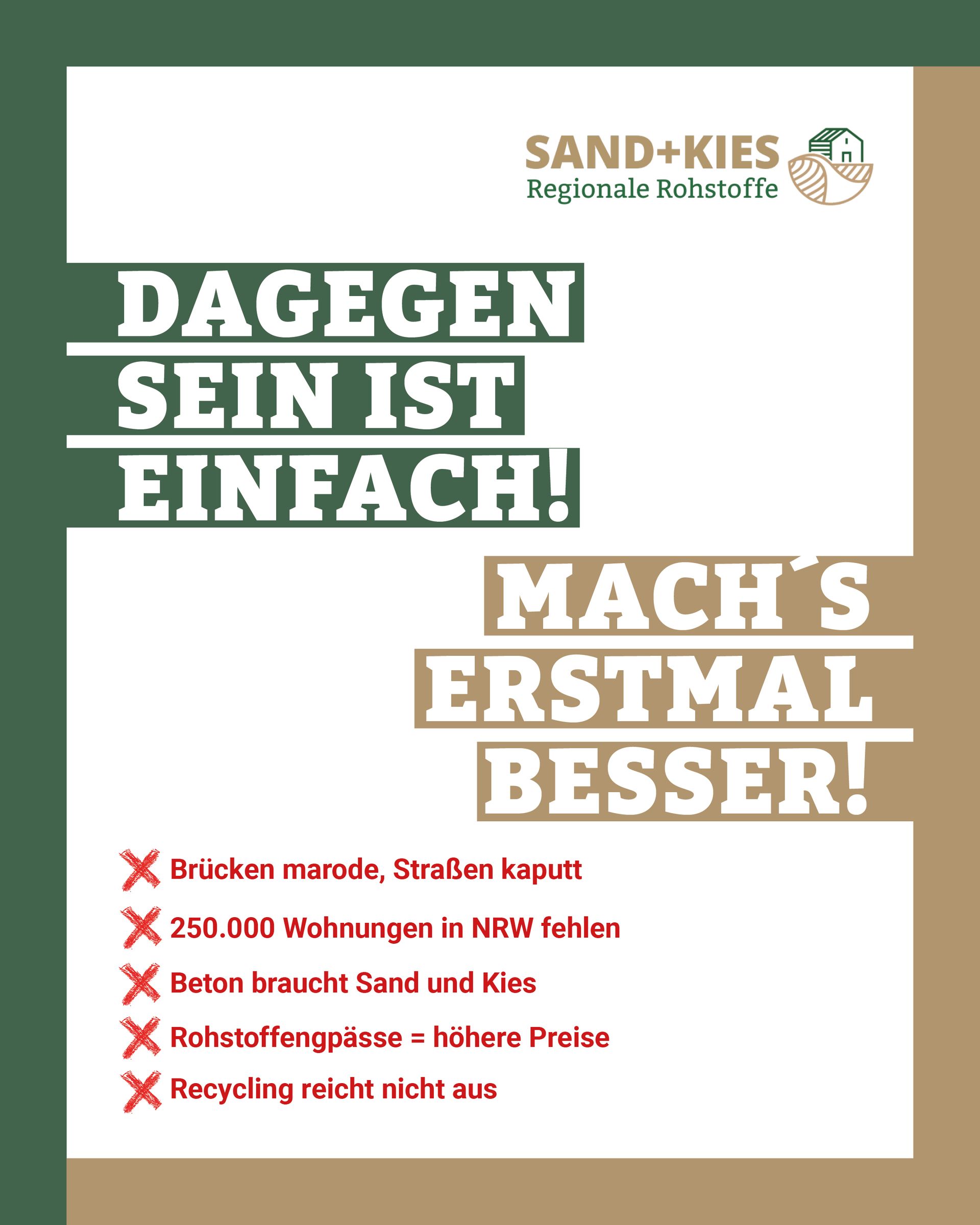 Ob Brücken, Straßen, bezahlbare Wohnungen, Schulen, Kitas oder Kanalisation: Wer all dies bauen will, braucht Sand und Kies. Vor allem unsere Infrastruktur hat eine Bau- und Sanierungsoffensive bitter nötig. Die regionale Gewinnung dieser wichtigen Baurohstoffe ist somit öffentliche Daseinsvorsorge. In eigentlich jeder Region, wo Sand und Kies dann tatsächlich gewonnen werden sollen, organisiert sich die Gegnerschaft – auch am Niederrhein. Diese "Dagegen"-Haltung greift die lokale Politik gerne auf. Sie wird aber vor Ort nicht in die Tat umgesetzt. Die Kommunen bauen fleißig weiter – natürlich mit Sand und Kies aus der Region. Dabei ist die Versorgung damit längst gefährdet! Der Einsatz von alternativen Baustoffen (Recyclingmaterial) wird zwar gefordert, aber entsprechende Bauprojekte sucht man meistens vergeblich. Auf diese Widersprüche möchte die aktuelle SAND+KIES-Kampagne am Niederrhein aufmerksam machen und einen konstruktiven Dialog rund um die regionale Rohstoffsicherung und -versorgung anbieten.