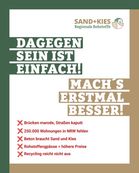 Ob Brücken, Straßen, bezahlbare Wohnungen, Schulen, Kitas oder Kanalisation: Wer all dies bauen will, braucht Sand und Kies. Vor allem unsere Infrastruktur hat eine Bau- und Sanierungsoffensive bitter nötig. Die regionale Gewinnung dieser wichtigen Baurohstoffe ist somit öffentliche Daseinsvorsorge. In eigentlich jeder Region, wo Sand und Kies dann tatsächlich gewonnen werden sollen, organisiert sich die Gegnerschaft – auch am Niederrhein. Diese "Dagegen"-Haltung greift die lokale Politik gerne auf. Sie wird aber vor Ort nicht in die Tat umgesetzt. Die Kommunen bauen fleißig weiter – natürlich mit Sand und Kies aus der Region. Dabei ist die Versorgung damit längst gefährdet! Der Einsatz von alternativen Baustoffen (Recyclingmaterial) wird zwar gefordert, aber entsprechende Bauprojekte sucht man meistens vergeblich. Auf diese Widersprüche möchte die aktuelle SAND+KIES-Kampagne am Niederrhein aufmerksam machen und einen konstruktiven Dialog rund um die regionale Rohstoffsicherung und -versorgung anbieten.